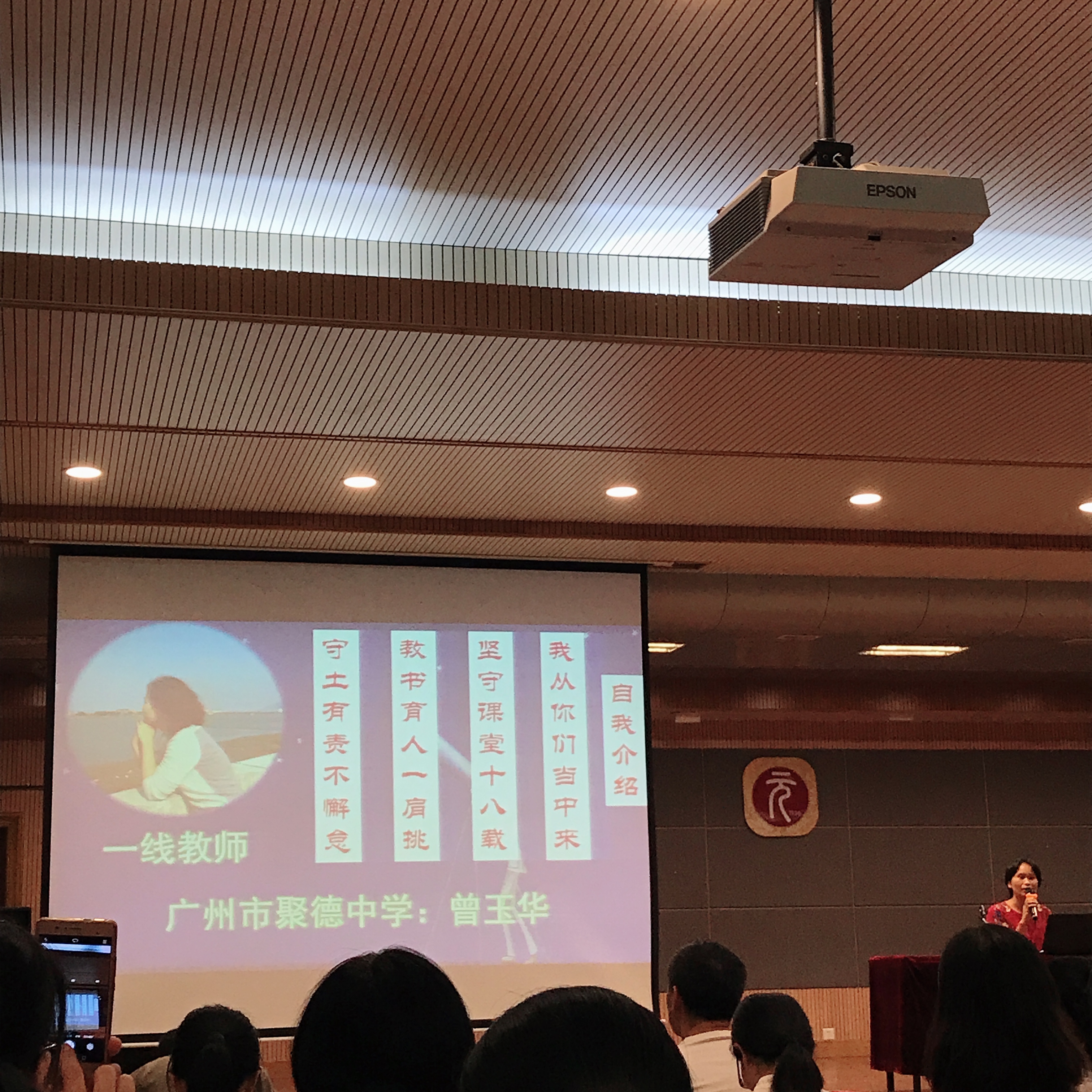 第一场,广州市聚德中学曾玉华老师以《仰望星空,脚踏实地》为主题开启了一线教师的教材培训收获分享。她以坚守课堂十八载的经历迅速拉近大家间的距离,接着她一一分享历次培训收获,最后向大家展示七年级部编教材的细致变化。