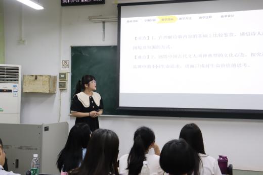 参赛选手各显身手,比赛过程异彩纷呈。邹婷婷同学从询问课文中的“方正”开展《陈太丘与友期行》的教学,带领学生朗读课文,进入文本情境。吴文婷同学创造性地从故事时间和叙事时间的角度,感悟叙事形式与内容的关系讲授《祝福》。蒙锐连同学从人与社会环境的关系入手教学《促织》,带领学生比较格里高尔与成名之子抗争精神的异同,给学生带来思考的空间。梁曦予同学从学生的课后问题切入,带领学生探讨《祝福》中“灵魂三问”的根与源。黄家秀同学采用联读的方法教学《短歌行》与《归园田居(其一)》,引导学生思考曹操和陶渊明的困境及不同的人生选择。余浩同学以情境式任务导入对《天上的街市》的讲授,课堂中充分运用朗读法,带领学生分析朗读中的语速、语气及重音。黄小珑同学运用反复诵读的方法教学《马说》,创造性地聚焦“也”字句与“不”字句,带领学生把握作者内心情感的变化。孟嘉琪同学以活动任务为主线设计《秋天的怀念》一课,分析出人生的根本意义在于实现生命对美好的追求。黄国纶同学通过带领学生“理解感动”教授《百合花》,分析小通讯员身上让人感动的淳朴、真诚、稚嫩等美好的品质。黄冰倩同学以“悟所感”为线索展开《壶口瀑布》的教学,从黄河之水的特点延伸到人经历磨难时的选择,引导学生理解中华民族坚强不屈、勇往直前的精神品质。
