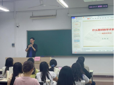 王老师首先开门见山地为同学们厘清了“学术”这一概念,他强调,学术是一种系统的、专门的学问,不同于工作报告和经验总结,并深入浅出地分析了学术论文的写作要点,以及论文写作与工作报告在目的、结构、语言表达等方面存在的差异。随后,王老师从四个方面详细阐述了如何写好学术论文。第一,问题引领。一篇好的学术论文必须有一个明确、具体的研究问题,这是整个论文的灵魂所在。第二,逻辑推进。在写作过程中,要遵循逻辑规律,确保文章的条理清晰、层次分明。第三,文献支撑。学术论文必须建立在广泛阅读和深入研究的基础上,通过借鉴前人的研究成果来完成自己的论文。第四,注重规范。在撰写论文时标题部分要有明确的针对性;摘要用客观语气表达;文献部分多征引大家、名家等。在讲座过程中,王老师还结合具体案例进行了生动的讲解,使同学们对学术论文的写作有了更加直观和深刻的理解。