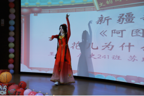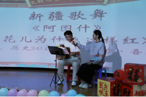 抽奖的欢乐未散,让我们将目光转向舞台表演,共同领略维吾尔族的独特魅力和塔吉克族的动人风情。历史241苏比伊努尔·吾麦尔同学带来民族舞蹈《阿图什》,衣袂如红霞缭绕,演绎出西域风气最炽热的模样;王睿老师以充满了塔吉克族民间诗歌特色的《花儿为什么这样红》,用吉他带我们走向诗和远方。
