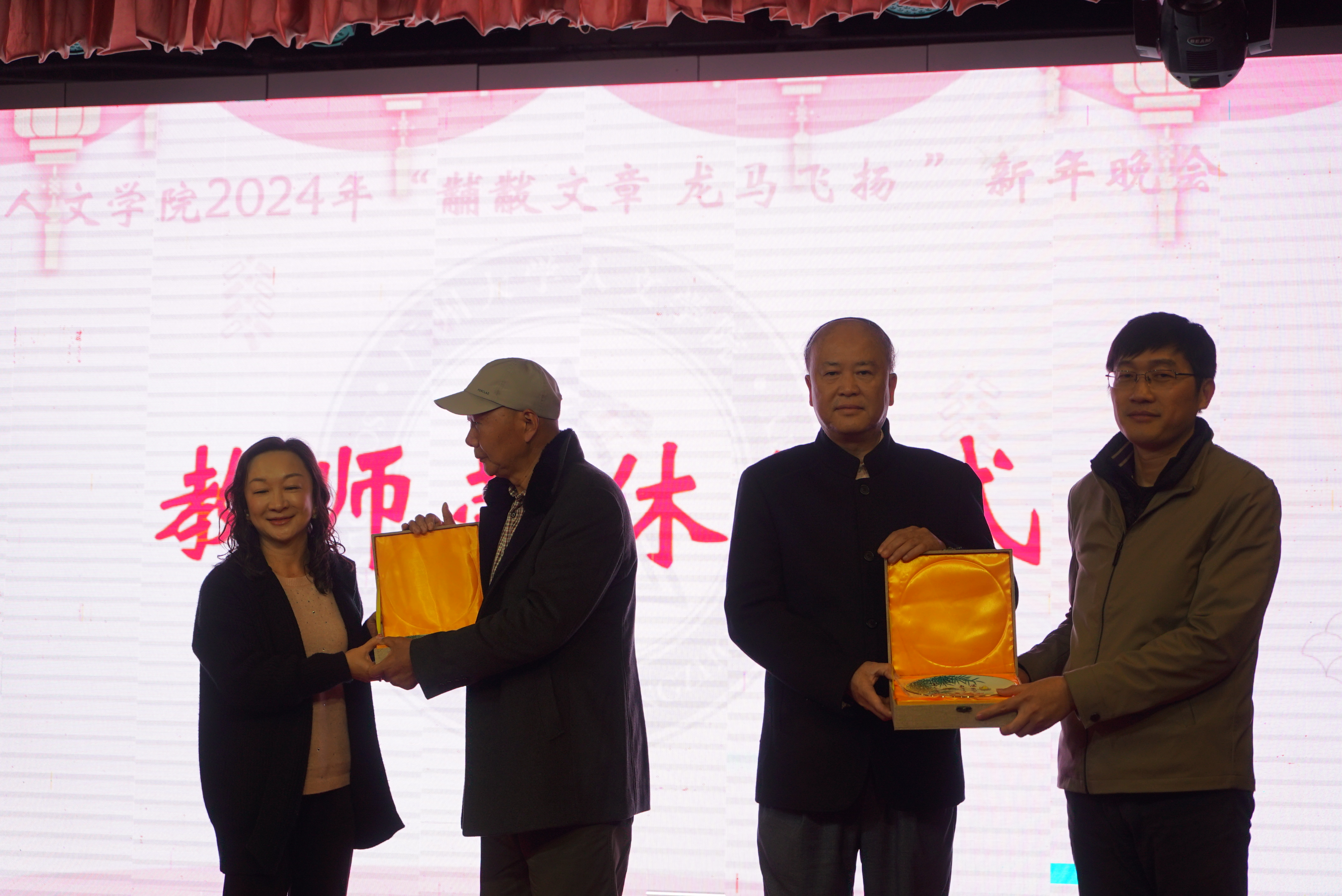 一场饱含深情与敬意的教师荣休仪式为晚会揭开序幕,禤院长代表学院向荣休教师汪学武、徐朝辉致以感谢和祝福,他们畅谈教学生涯感悟,显现出人文教师大家庭甘于奉献的精神和携手共进的温情。